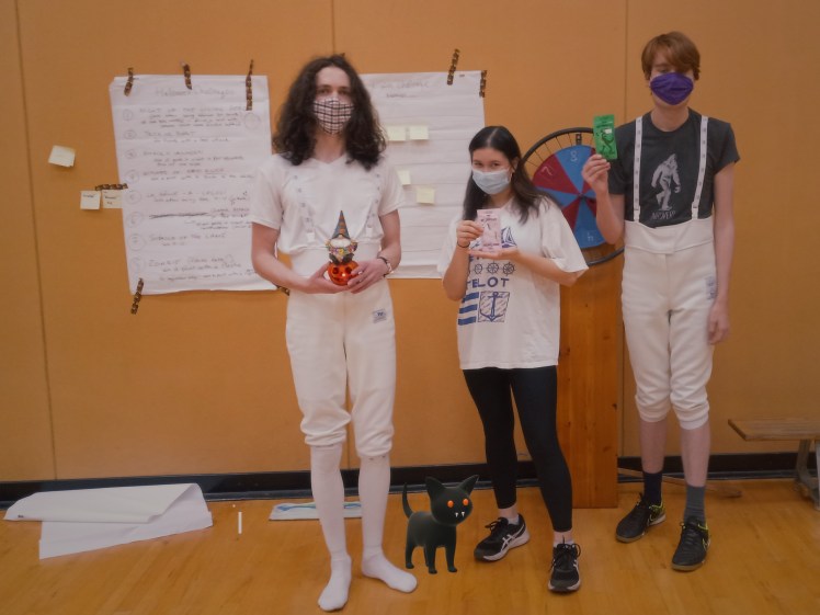 The triumphant three were undeterred by the terrible puns, with Lawrence taking top prize for his many “Attack O Lantern” wins (winning all touches at opponent’s end of the piste). I am told Lawrence and his gnome enjoyed watching the World Series (#wrongsport) on Hallowe’en. Noelle and Felix won second and third places, and took home hot chocolate that spookily promised to change colour.